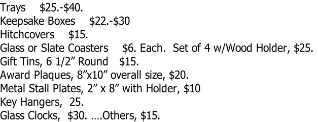 These items display your own (or our) artwork. All can be personalized and will be made using anything you wish to supply, photos and lettering. Images are permanent and completely waterproof